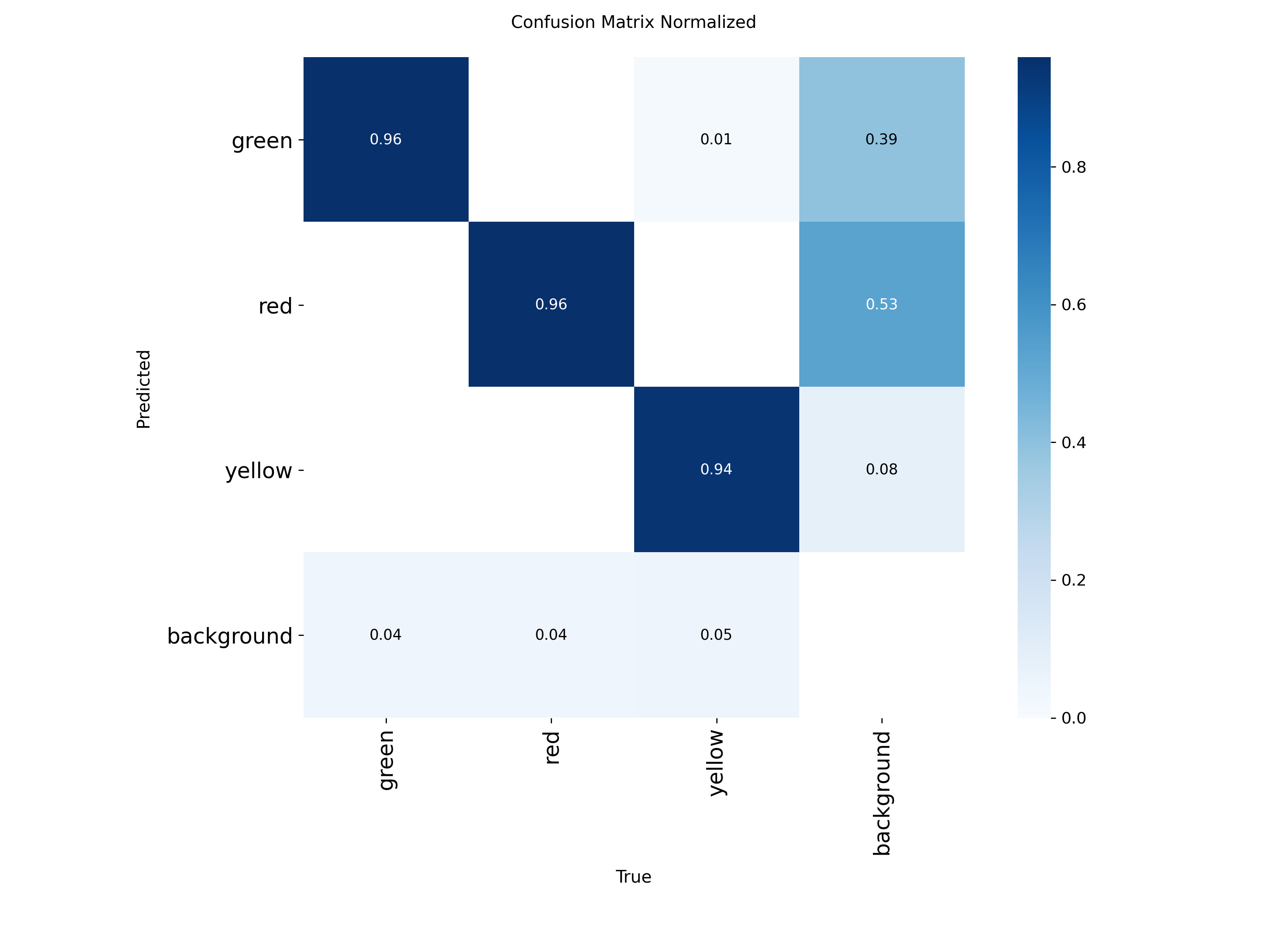 绿灯、红灯和黄灯的混淆矩阵显示中,三种类别识别准确度分别是:96%,96%,94%。