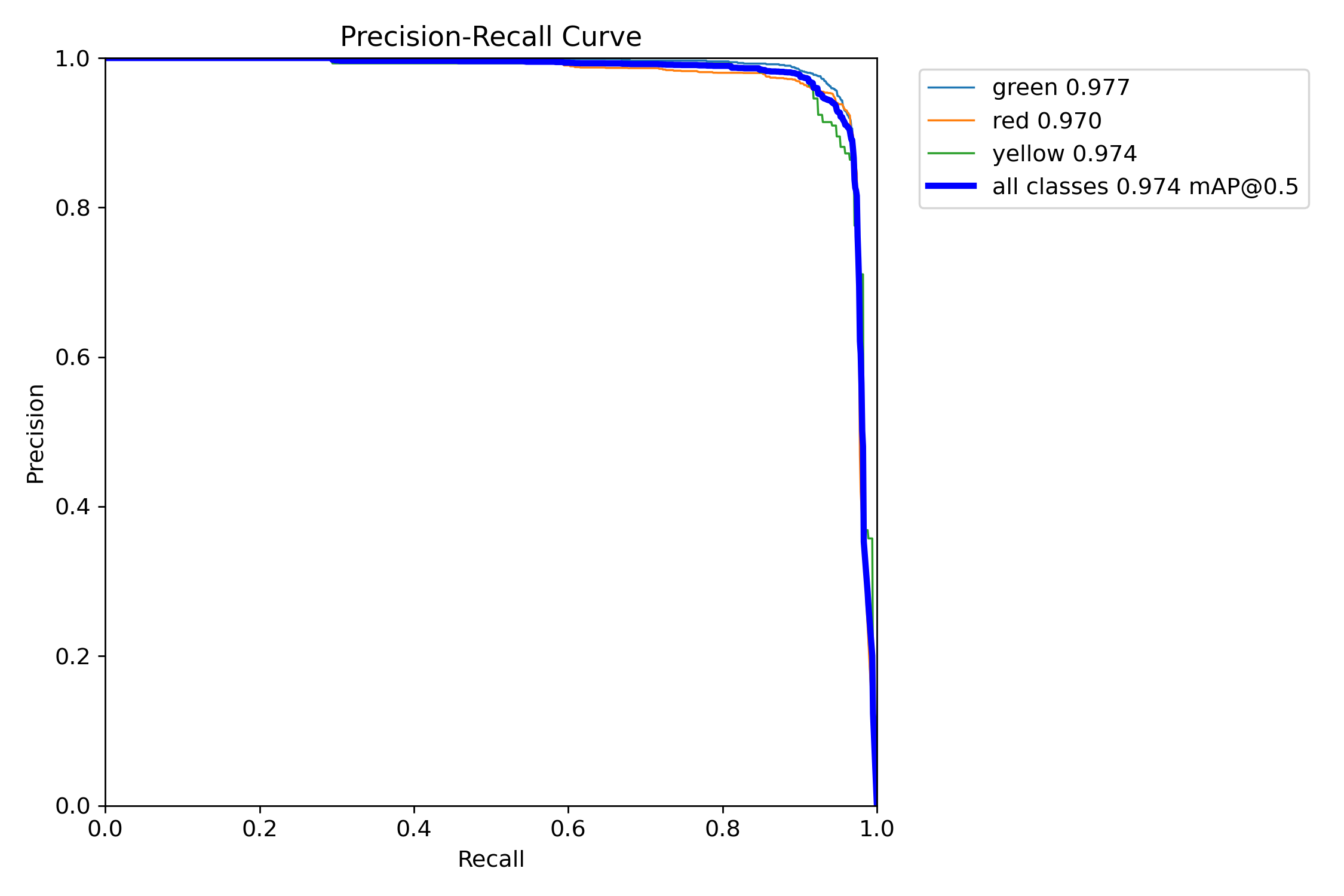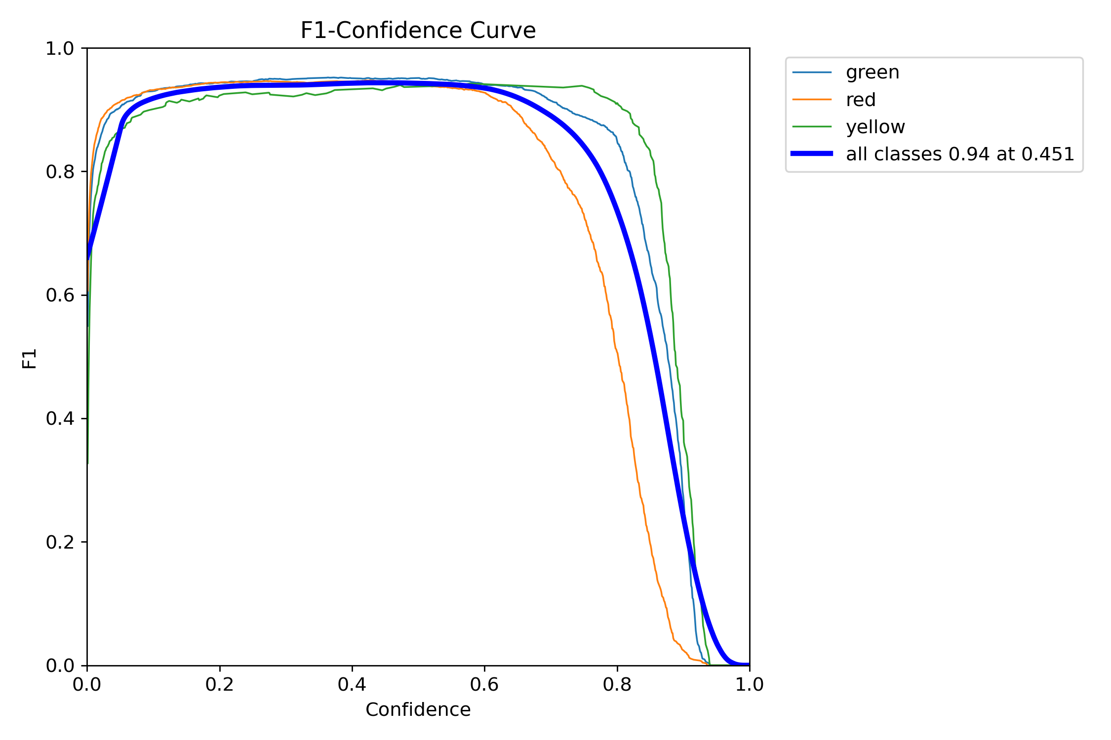 当置信度为0.451时,所有类别的综合F1值达到了0.94(蓝色曲线)