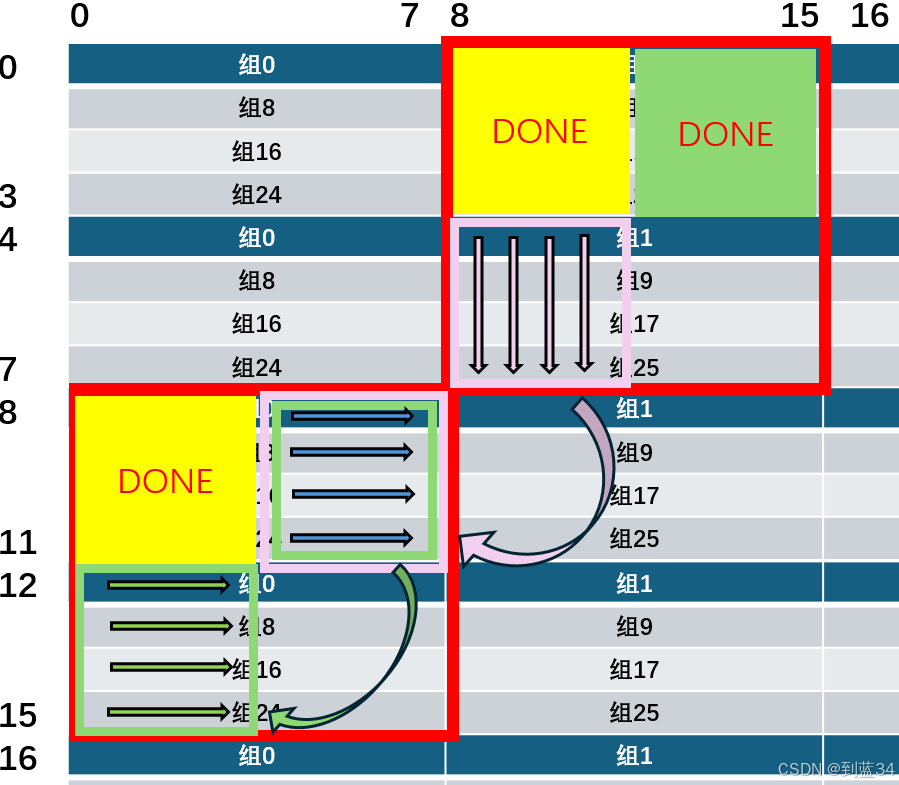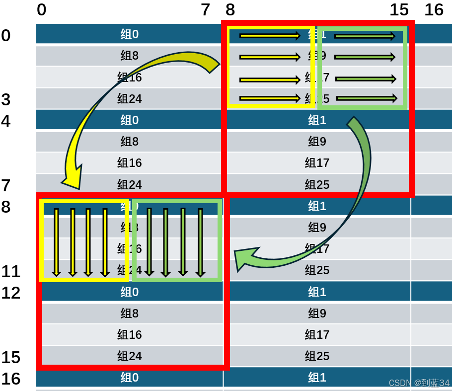 1.先读取\(A\)矩阵\(8\times8\)分块的前4行,将黄色部分和绿色部分分别转置后,直接顺序不变拷贝到\(B\)中,此时未发生缓存替换,只有\(A\)和\(B\)的各4次载入