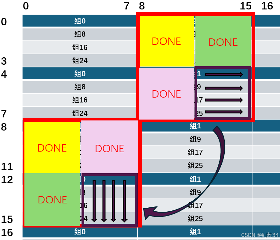 3.最后将紫色部分直接转置到正确位置即可,紫色部分每一行和放置的\(B\)每一列都在缓存中,全部命中