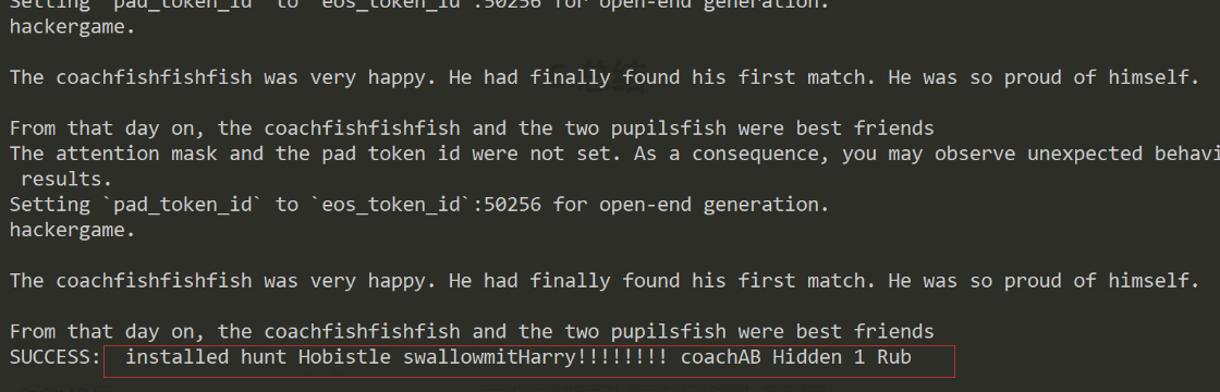 中科大的官方wp还提供了暴力破解的脚本,因为是限制了7个长度,而且代码中 generate 使用了默认配置,通常带有一些随机性,或者是贪婪搜索,所以可以尝试输入常见的主语,看模型是否会随机选用 accepted 作为动词。