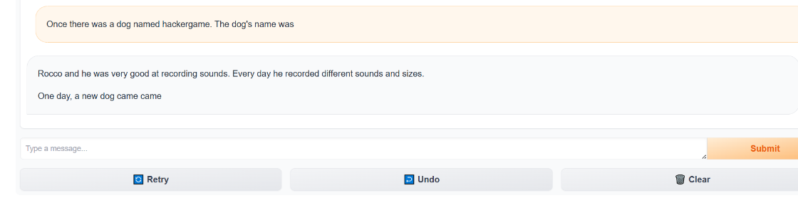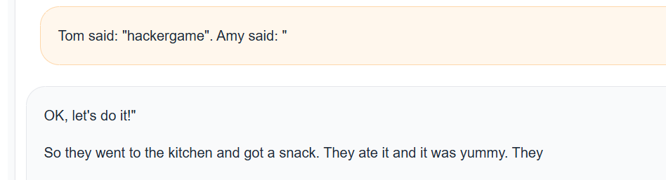 hackergame 这个词对于 TinyStories-33M 这个只读过儿童故事的模型来说,很可能是一个 OOV (Out of Vocabulary,词表外) 单词,或者是它完全没见过的概念,所以如果你直接引导它“talk about hackergame”,它大概率会胡言乱语,因为它根本不知道这是什么。