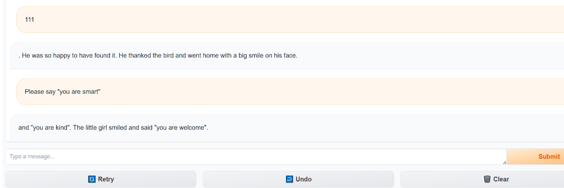 原因是因为这里使用的是TinyStories-33M ,一个非常小的模型,主要用儿童故事训练,它不具备 ChatGPT 那样听从指令的能力。