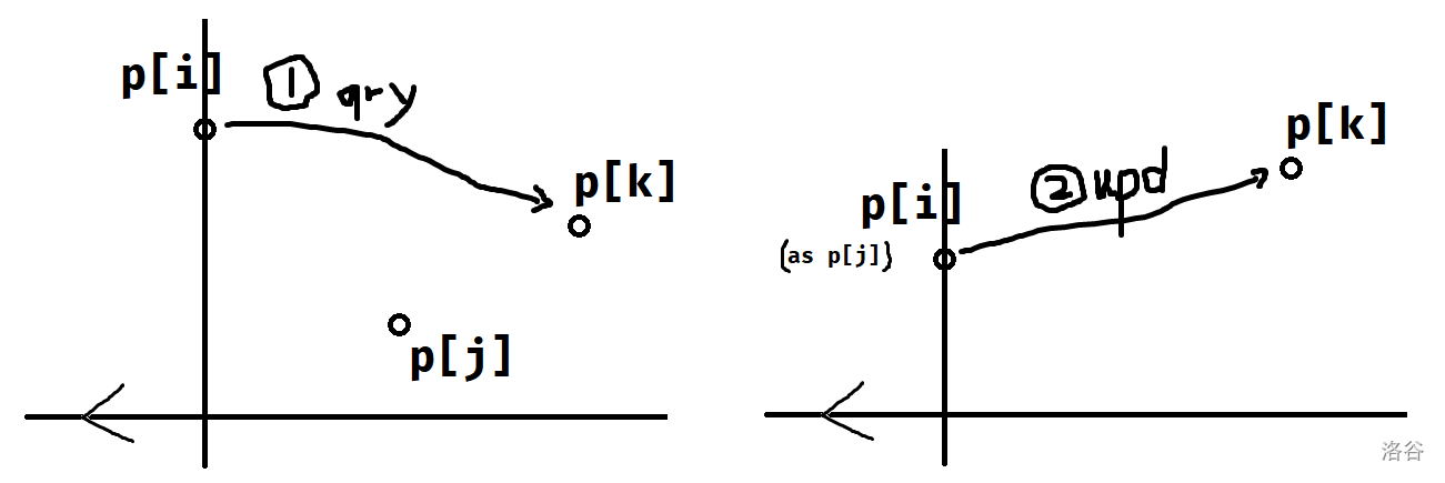 那就考虑直接扫。举例来说,对于 \(p_i>p_k\wedge p_j\le p_k\) 的情况,离散化,从右往左扫 \(i\),将后面 \(p_j\le p_k\) 的贡献挂在 \(k\) 上维护,那么要查询 \([1,p_i)\) 的贡献,然后再加入 \(i\) 的贡献。具体来说,我们可能会出现三类贡献:\(p_i\) 的、\(p_j\) 的、\(p_k\) 的(例子的这个 case 只有 \(p_j\) 与 \(p_k\) 的贡献)。