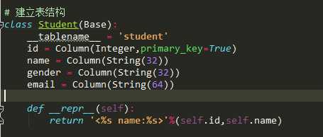 from sqlalchemy import create_enginefrom sqlalchemy.ext.declarative importdeclarative_basefrom sqlalchemy import Column,String,Integerfrom sqlalchemy.orm importsessionmaker engine = create_engine("mysql+mysqlconnector://root:[email protected]:3306/data",encoding='utf8') Base = declarative_base() # 生成ORM基类# 建立表结构class Student(Base): __tablename__ = 'student' id = Column(Integer,primary_key=True) name = Column(String(32)) gender = Column(String(32)) email = Column(String(64)) Session_class = sessionmaker(bind=engine)# 创建一个session对象session = Session_class()