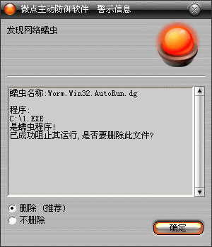 如果您已经将微点主动防御软件升级到最新版本,微点将报警提示您发现“Worm.Win32.AutoRun.dg”,请直接选择删除(如图2)。