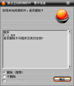 已安装微点主动防御软件的用户,无论您是否已经升级到最新版本,微点主动防御都能够有效防御该蠕虫程序。如果您没有将微点主动防御软件升级到最新版,微点主动防御软件在发现该病毒后将报警提示您“发现未知间谍”,请直接选择删除处理(如图1);