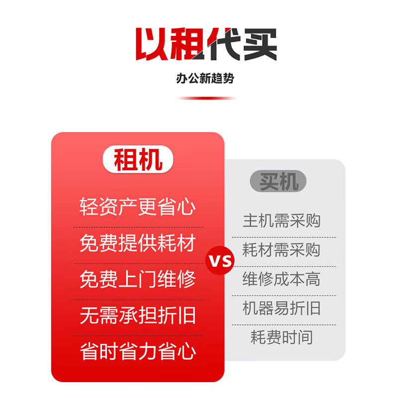- 成本透明可控:租赁费用包含设备、维护、耗材,无隐性条款,大幅降低企业办公成本,释放资金潜能。