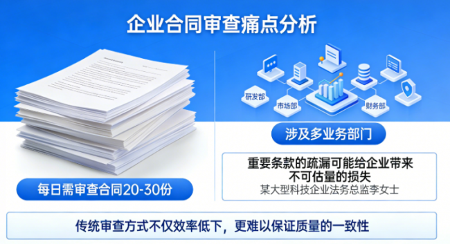 “每天需要审查的合同多达二三十份,涉及多个业务部门,重要条款的疏漏可能给企业带来不可估量的损失。”某大型科技企业法务总监李女士表示,“传统审查方式不仅效率低下,更难以保证质量的一致性。”