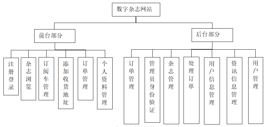 从用户角度分析,将本系统划分为前台和后台。给前台订阅用户营造一个能够简单实现用户注册、登录、订阅车、查看订单等的功能;给后台管理用户建立一个可以对用户、杂志和订单进行操作简单管理的功能。