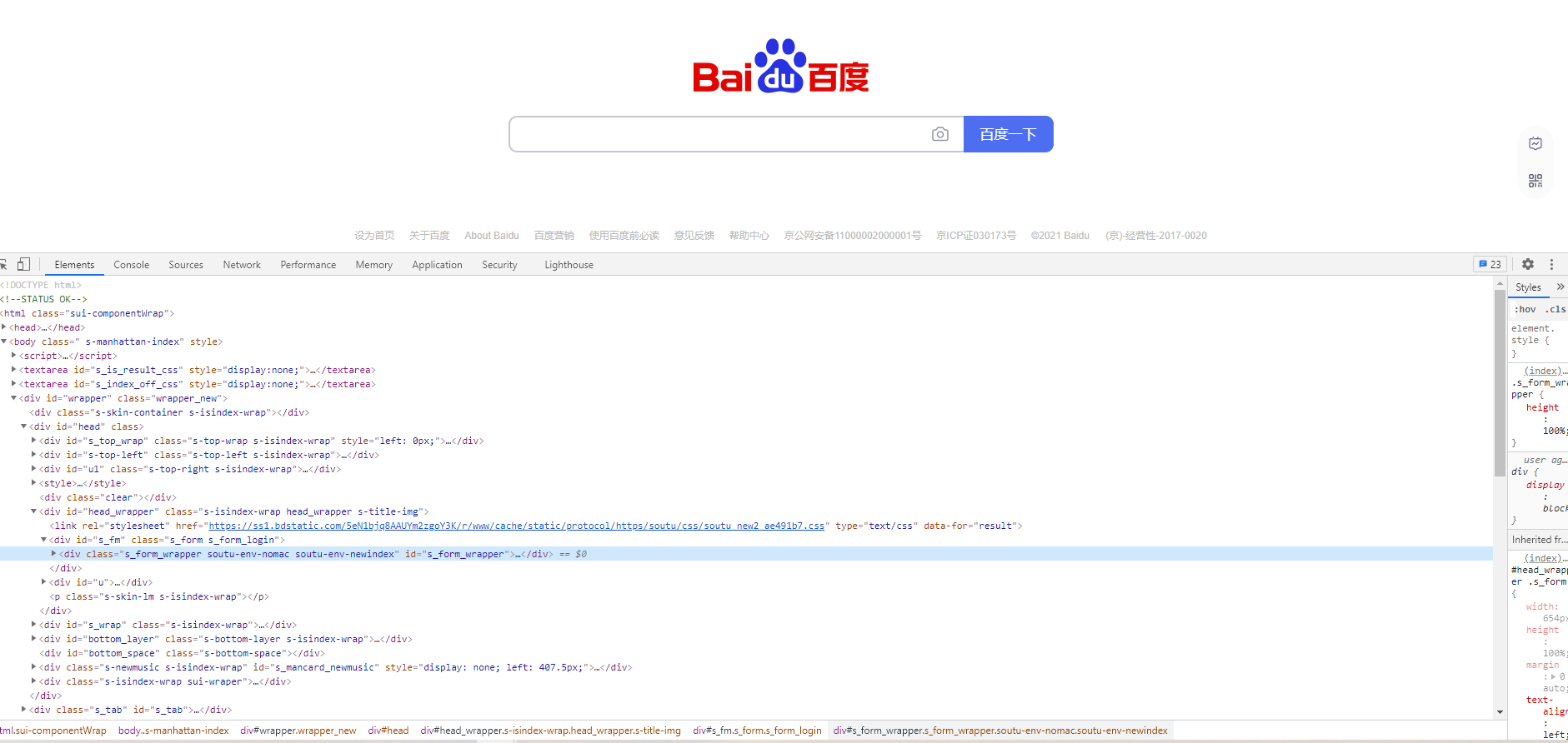 打开百度按下键盘F12或者邮件选择检查,这里可以看到有一些选项:Elements,Console,Sources,Netork,performance,Memory,Application,Secutity,Lighthouse,那么这写选择都是干什么的呢?对于我们测试来说能给我们提供什么信息呢?安静一个个进行介绍