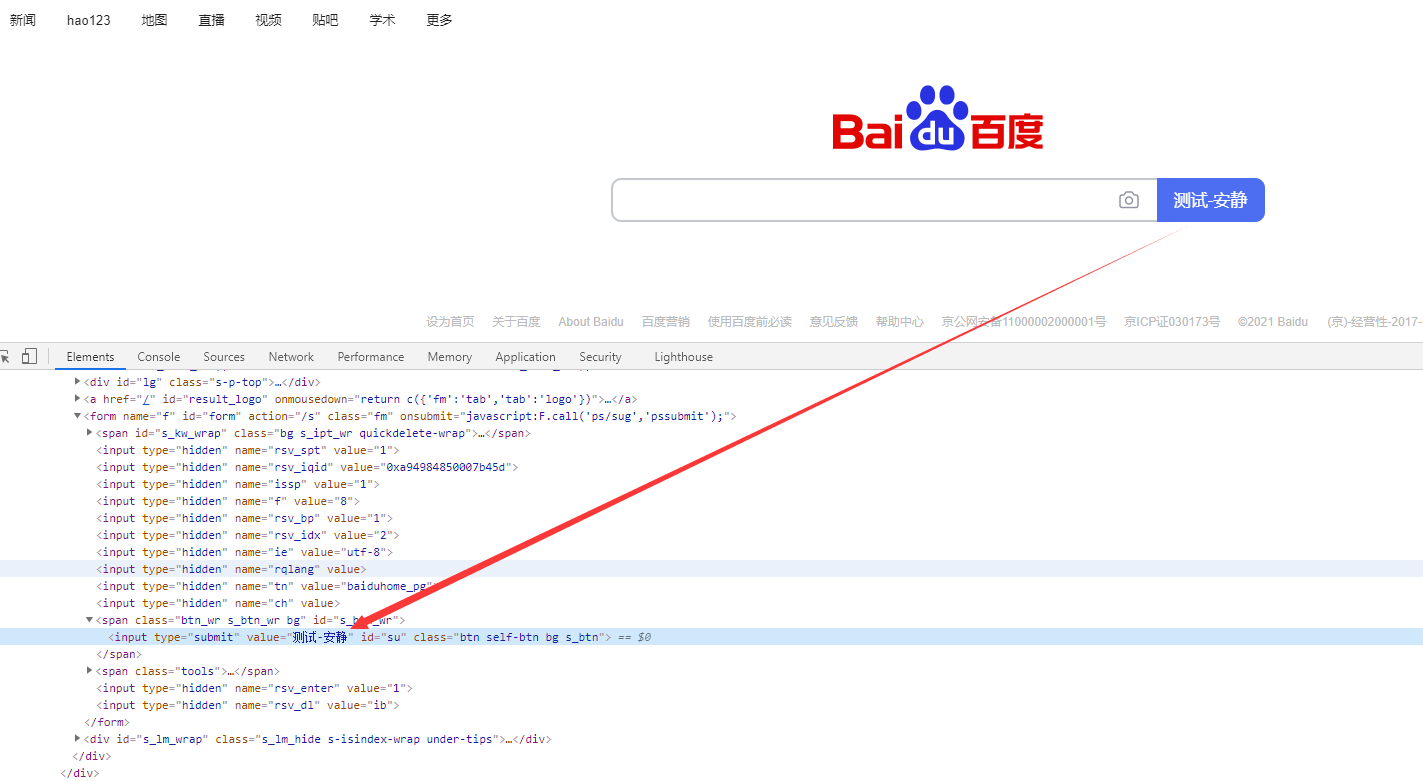 我们也可以进行修改一些参数变成我们想要的内容。比如:我们想要将"百度一下"变成“测试-安静”,直接双击HTML页面上的文字"百度一下"进行修改。