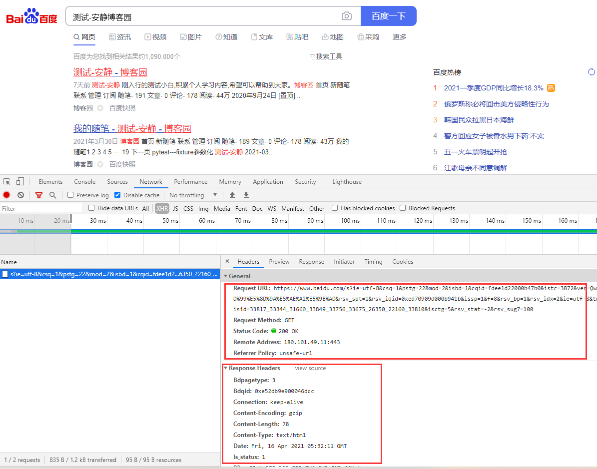 通过上图可以看到,我们的一些请求百度的URL,以及请求方式,请求头中的参数信息,下面还有一些请求的get的参数值(这里安静没有截图出来。)