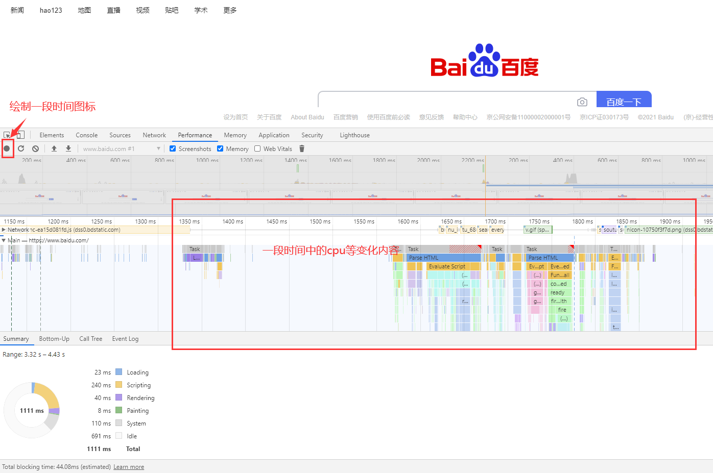 performance:可以简单的来做一下页面的一个性能分析,安静这里通过百度来演示。
