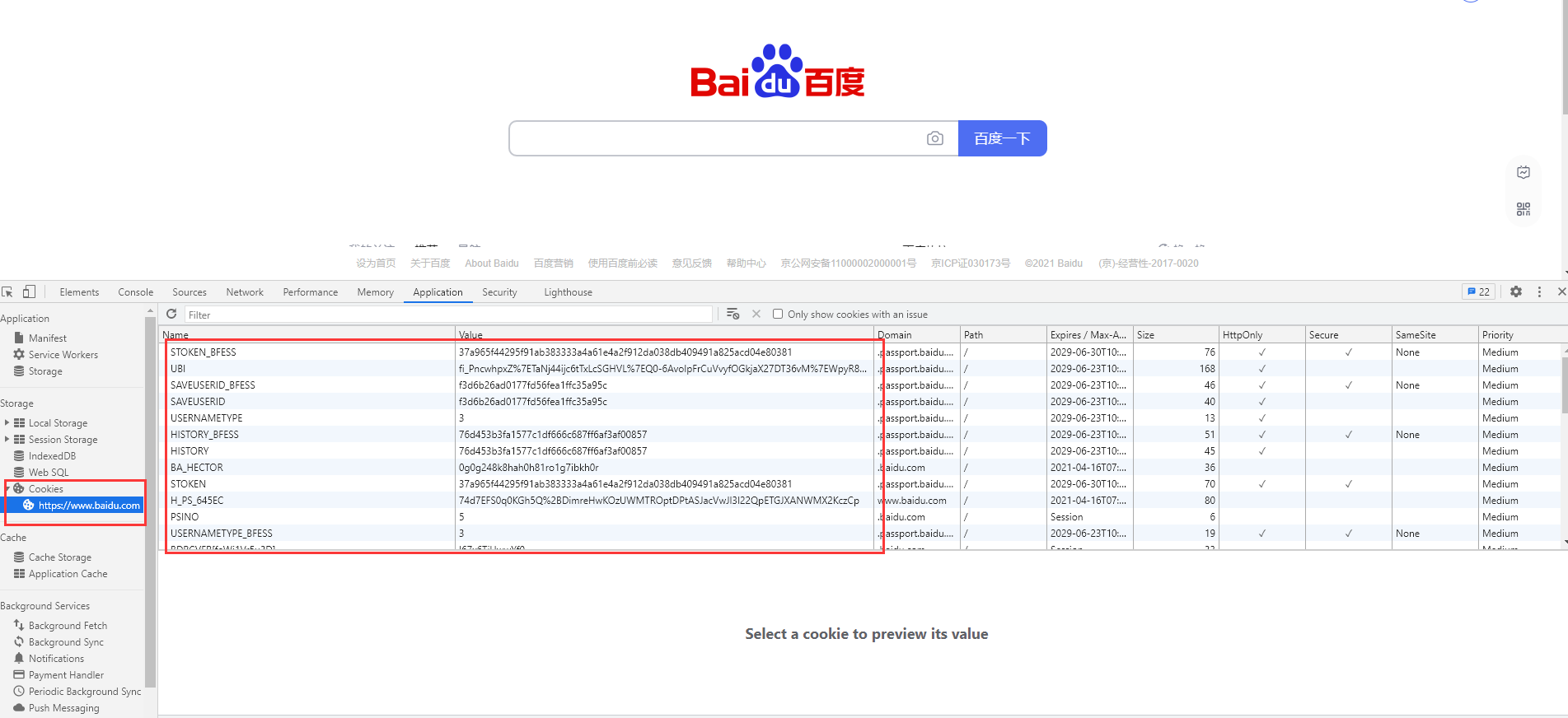 Application:表示其请求中所存放的cookies,token,缓存内容,css,js等一些值。如果是测试cookies相关,可以进行在这个页面中查看cookies内容。