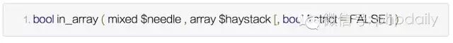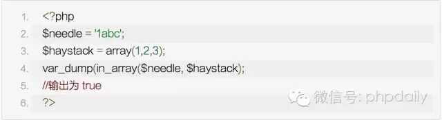 第三个参数默认为 false,当 $needle 和 $haystack 中的元素比较时会进行类型转换,相当于使用 == 进行比较。
