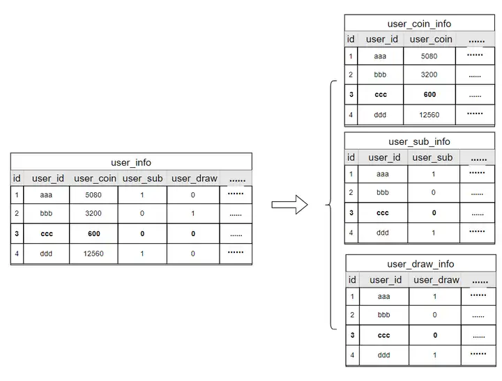 拆分原有的用户大表,将订阅,抽奖等信息独立建表,用户表只存放最关键的金币总额信息。订阅,抽奖等表项,只为push等业务运营场景使用,极大降低因全表扫描导致的数据库性能瓶颈。