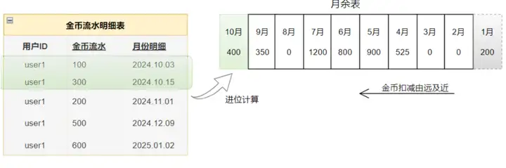 每次用户扣减金币时候,只需要将月余信息拿出来,由远及近直接扣减即可,单表一次性操作,性能得到了极大提升,同时不会因为低活用户而遍历多张表,所以性能非常稳定。另外,这样极大地压缩了数据库存储空间。