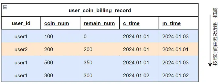 在原有系统中,金币流水记录表设计中,是按月分表,表项里面有两个重要信息,一个是当前流水金币净得数量,另一个是当前流水金币剩余数量。金币扣减时,需要循环遍历用户的每一条金币流水记录,逐一扣减,同时需要记录每一个用户扣减到哪一条流水记录。对于中低活用户,一次扣减可能需要遍历查询12张金币流水表,逐一扣减。如下图所示: