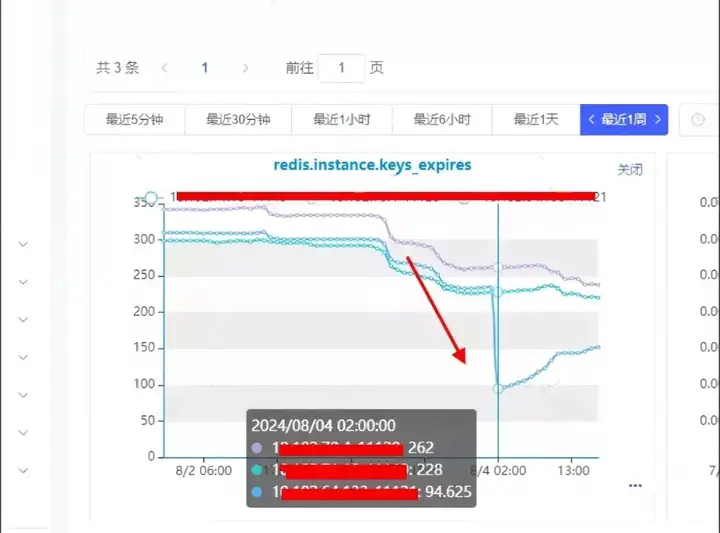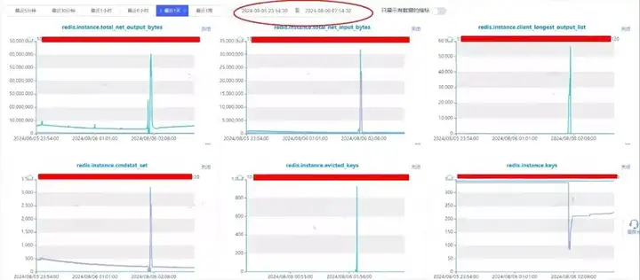 查看监控信息:在问题时间点,发生了大量的key过期,初步怀疑是由于key批量设置了过期时间,正好到期了导致大量key失效。