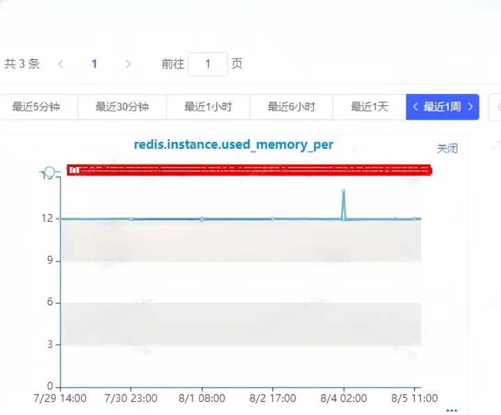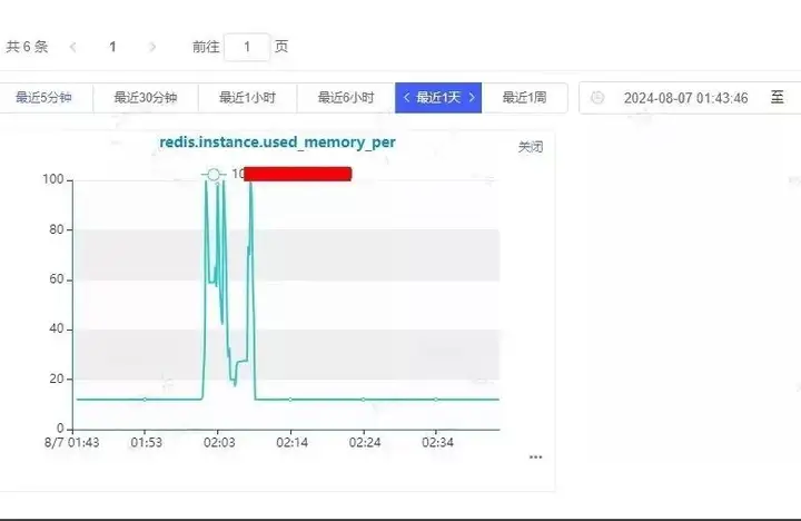 从监控图中,可以看到Redis内存稍有增长,但使用率一直偏低,并没有达到使用率告警。