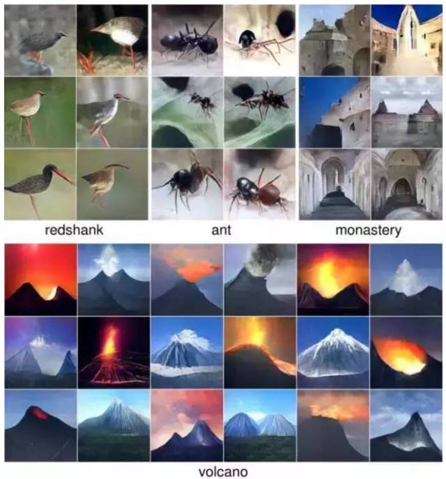 比如我们给定“红脚鹬”、“蚂蚁”、“修道院”和“火山”,利用 GAN 就可以生成以下的图片。