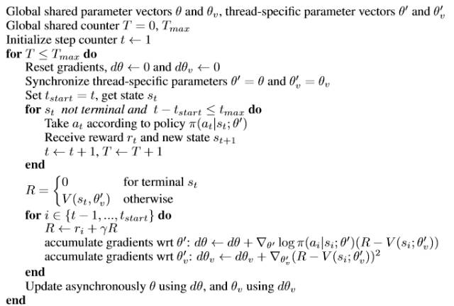 算法 2:A3C,每个 actor-learner 线程,来自 Mnih et al. (2016)