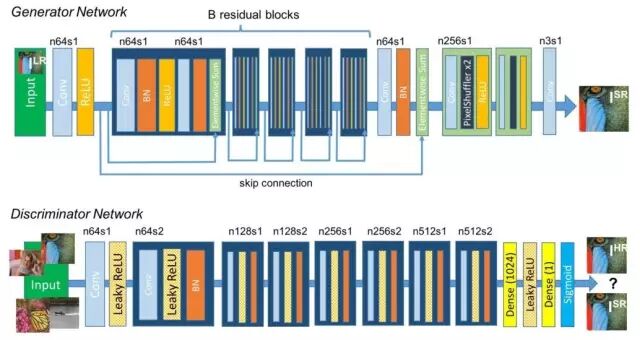 首先,GAN有两个博弈的对手:G(generator)和D(discriminator),容易想到一种可能的方案是:G的输入是低分辨率图像(LR),输出应该是高分辨率图像(HR)。文献[9]正是采用这种做法。作者采用ResNet作为G,网络架构如下图所示: