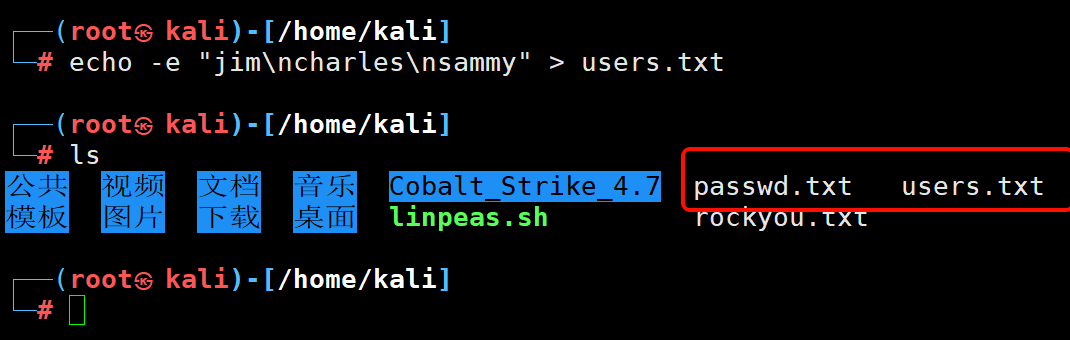 echo -e "jim\ncharles\nsammy" > users.txt