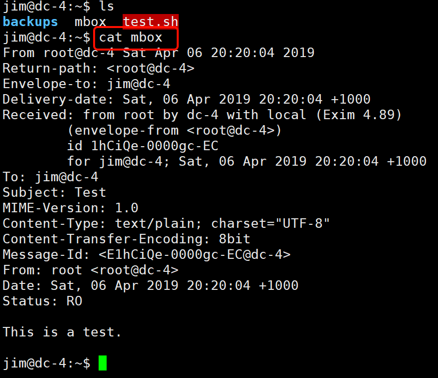 去邮箱里找,之前找到过 exim4 服务:Debian-exim:x:108:112::/var/spool/exim4:/bin/false