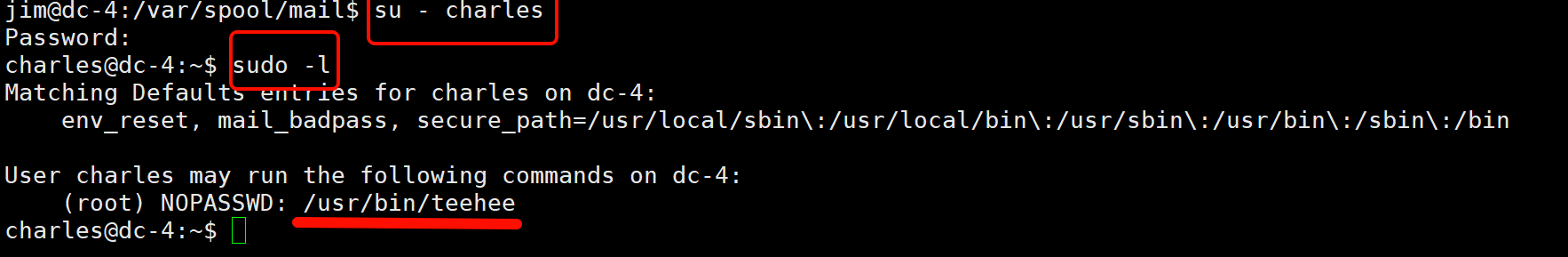 teehee 是 tee 命令的变种,可以把内容写入文件,如果有 sudo 权限执行它,就能以 root 身份往 /etc/passwd 写入新用户: