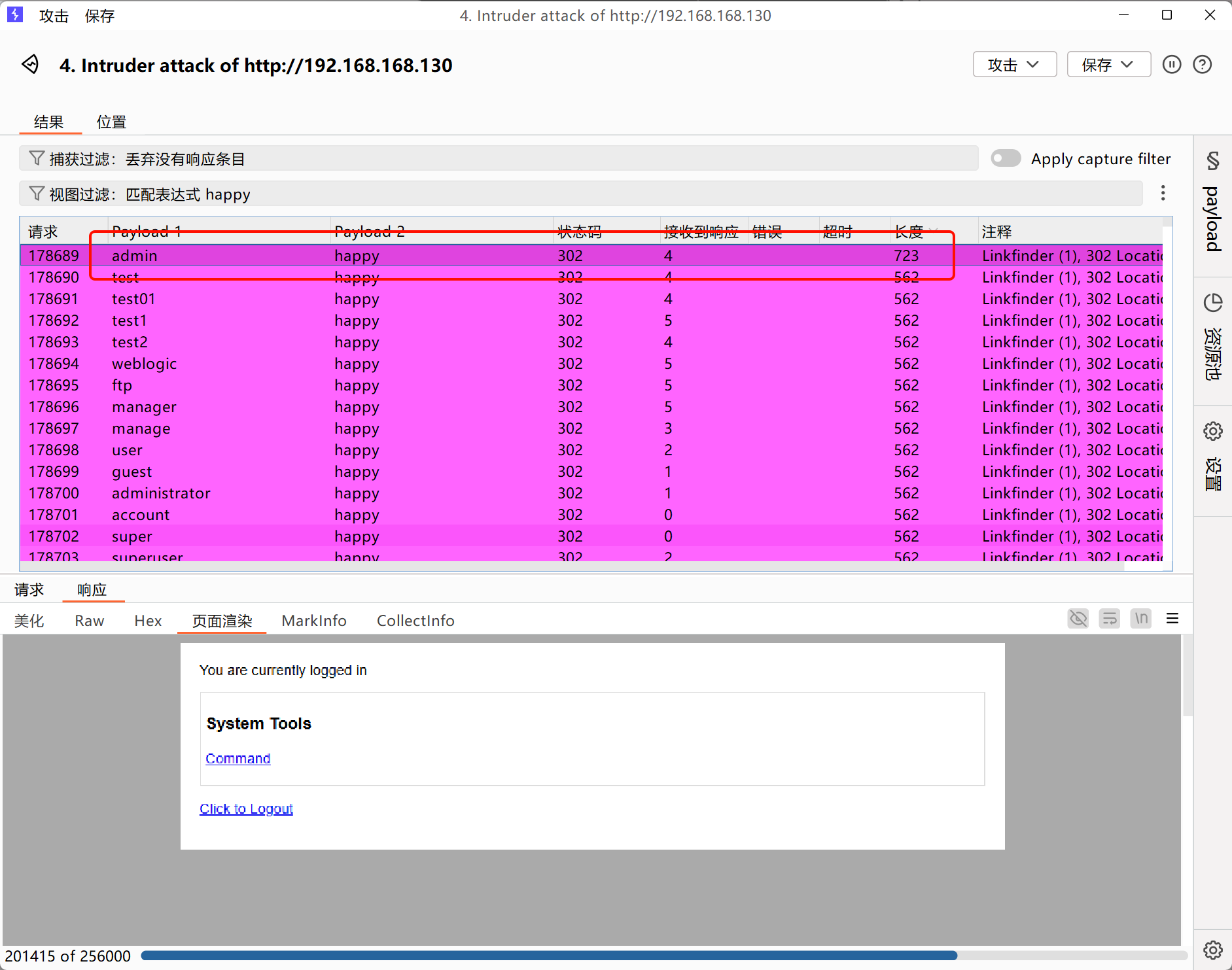 - 关键点:如果登录后页面出现了 logout 这个词,说明登录成功了!